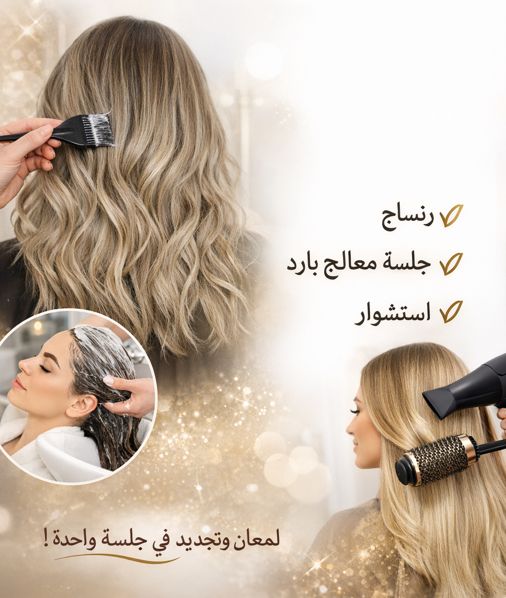 تشمل الباقة جلسة رنساج لتعديل درجة اللون أو إزالة التدرجات غير المرغوبة، يليها جلسة معالج بارد لترطيب الشعر وتحسين ملمسه، وتُختتم باستشوار احترافي لإطلالة مرتبة ومنتعشة.