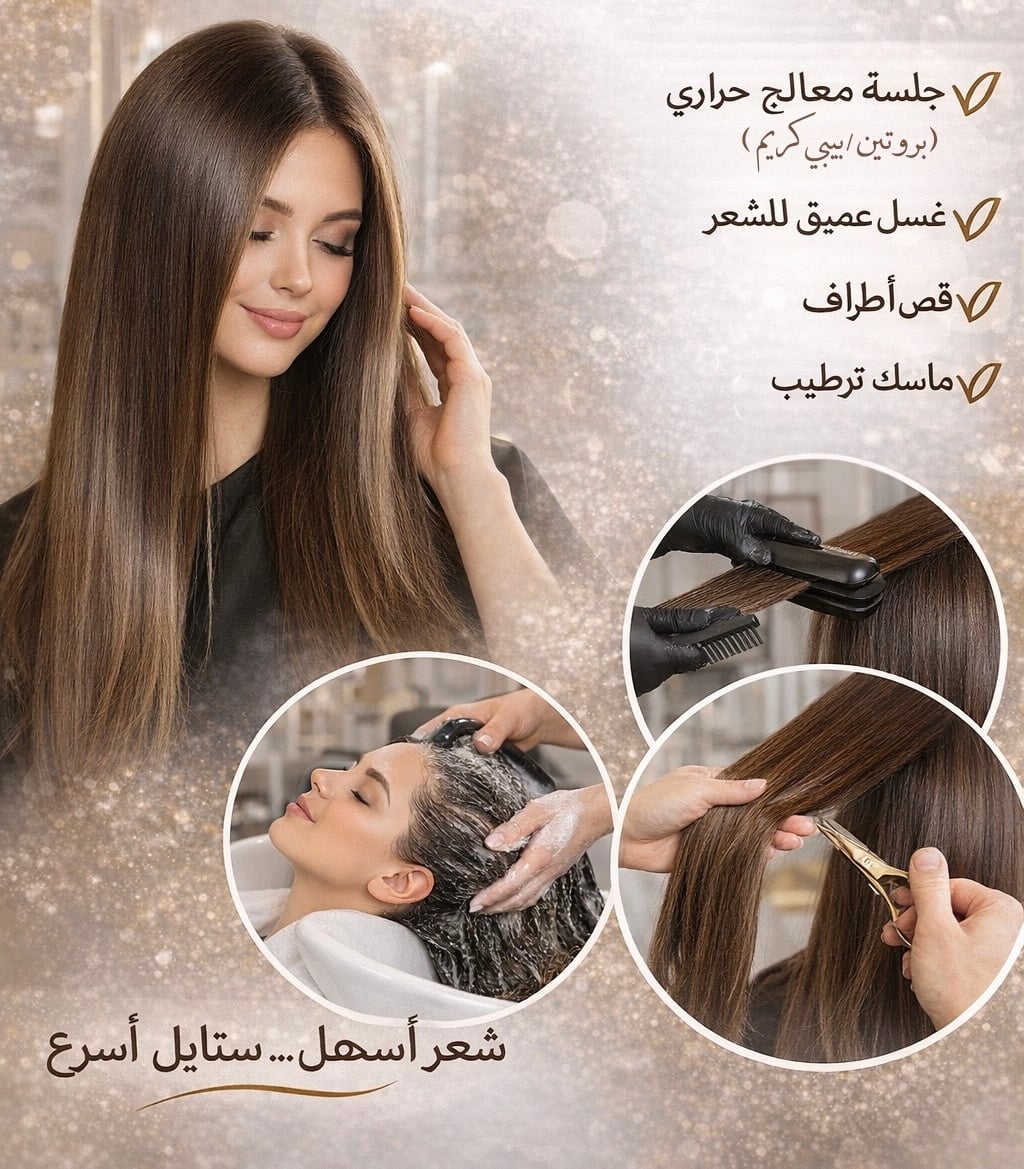 تشمل الباقة جلسة معالج حراري باستخدام البروتين أو البيبي كريم حسب حالة الشعر، مع غسيل عميق لتنظيف الشعر من التراكمات، ثم قص أطراف لتحسين مظهر الشعر والتخلص من التقصف.