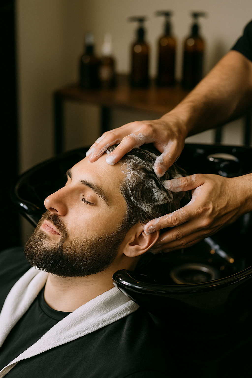 غسيل وتنظيف منعش بفوم وشامبو مع تدليك بسيط لفروة الرأس.