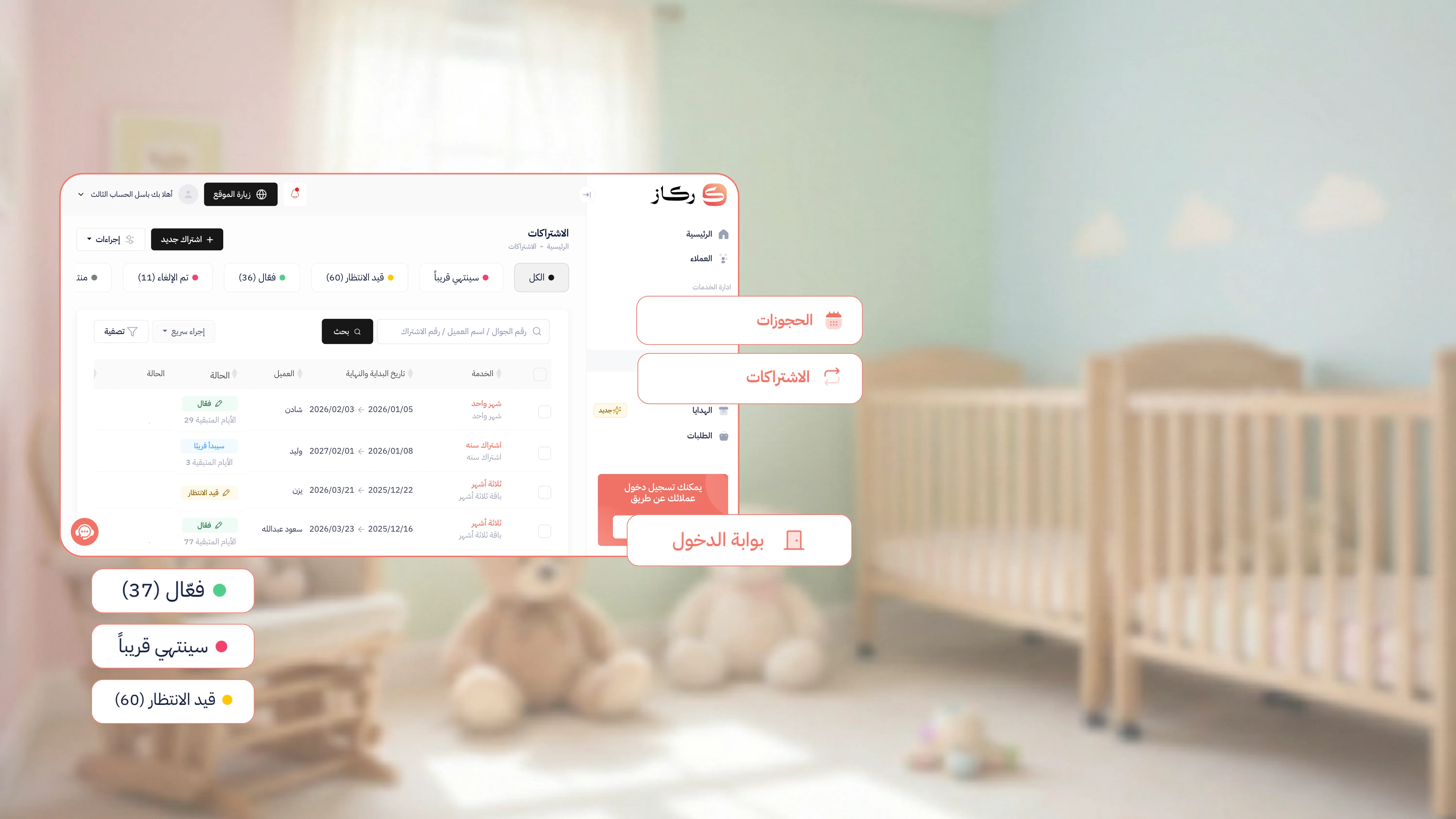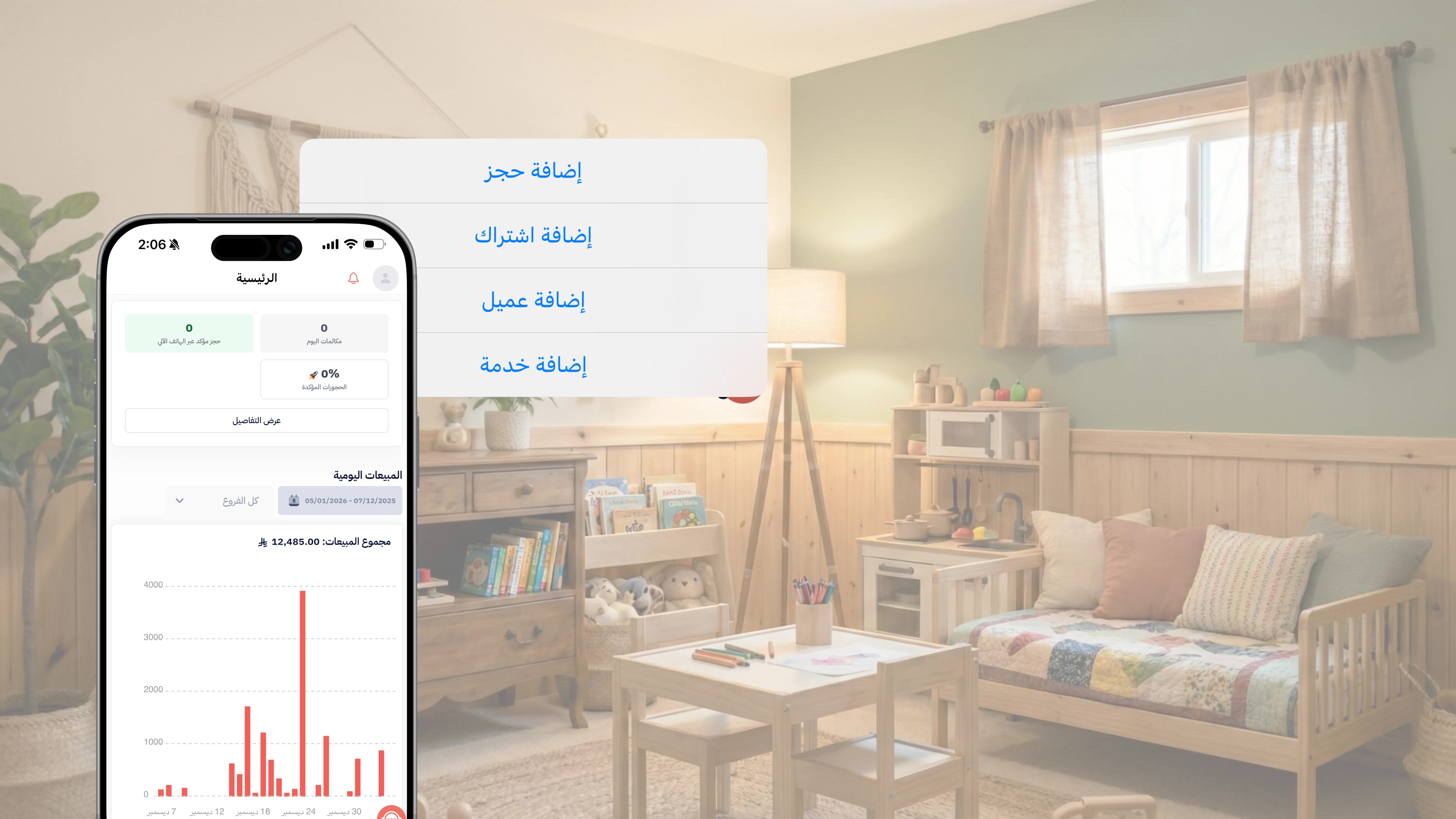 ينظّم الأطفال٬ الاشتراكات، والفواتير في مكان واحد، عشان تدير الحضانة بسهولة وتركّز على التطوير