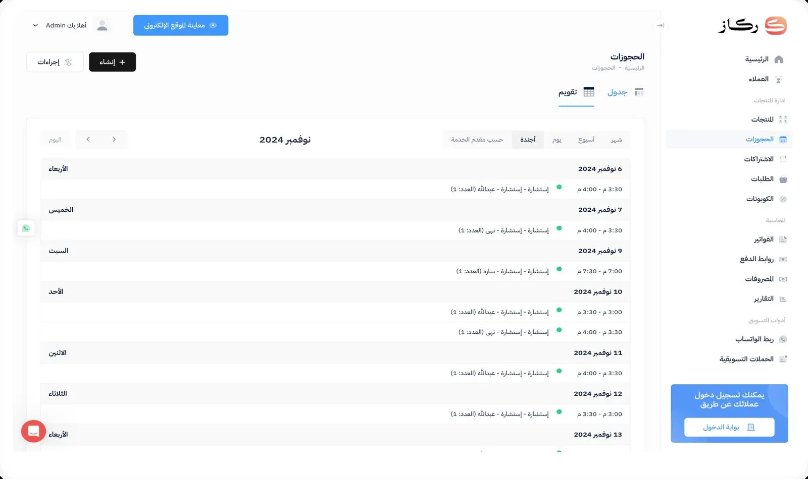 يتيح لك نظام الحجز و الإشتراك المتكامل في ركاز إدارة وتنظيم خدماتك بكفاءة تامة، مما يبسط سير العمل اليومي ويوفر لك الوقت. استمتع بواجهة سهلة الاستخدام، تساعدك في جدولة المواعيد ومتابعتها دون تعقيد.