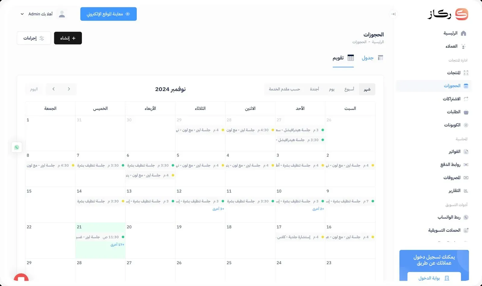 يتيح لك نظام الحجز و الإشتراك المتكامل في ركاز إدارة وتنظيم خدماتك بكفاءة تامة، مما يبسط سير العمل اليومي ويوفر لك الوقت. استمتع بواجهة سهلة الاستخدام، تساعدك في جدولة المواعيد ومتابعتها دون تعقيد.