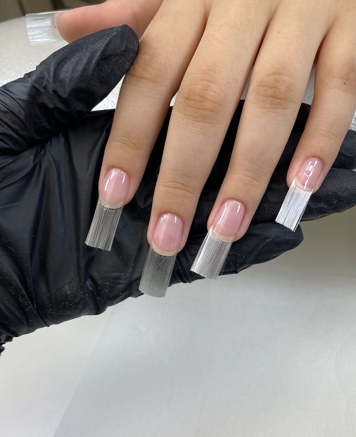 تركيب شعيرات فايبرجلاس لتمديد الظفر وتقويته، تُثبت باستخدام لاصق خاص وتُغطى بطبقة نهائية من الجل لنتيجة أنيقة وطبيعية - Fiberglass strands applied to extend and strengthen the nail, fixed with glue and finished with a natural, sleek overlay