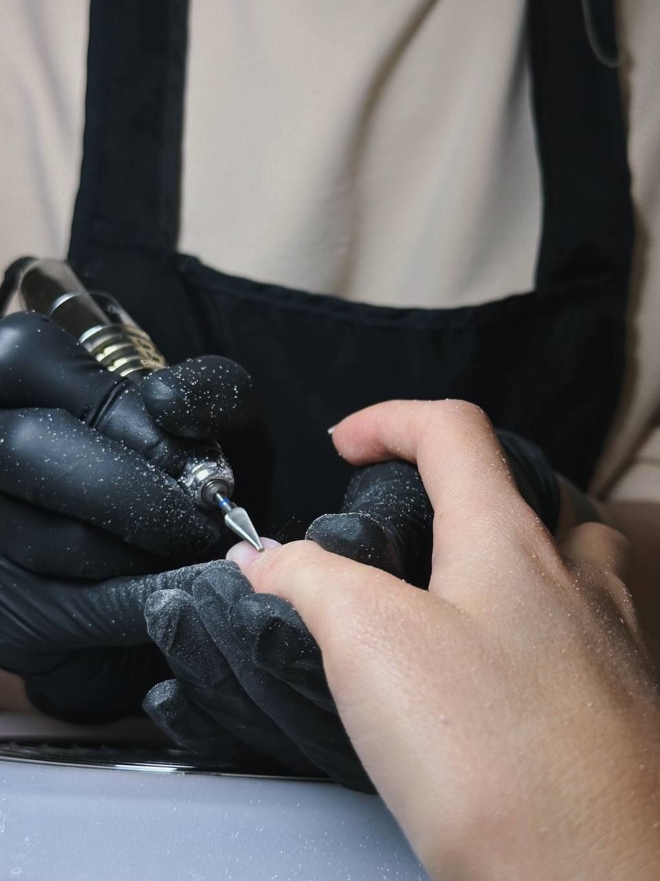 A precise Russian-style manicure using specialized electric tools to deeply remove cuticles without water — for a clean and elegant result.
