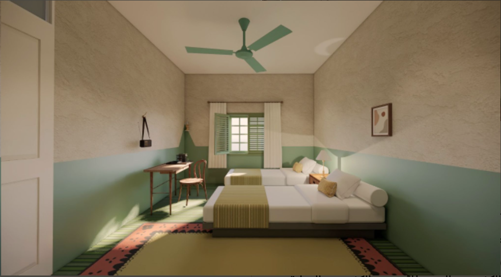 التوزيع عملي، بحيث كل غرفة لها خصوصيتها مع قربها من الحمامات المشتركة، وبعض الغرف مميزة بإطلالات ومساحات أكبر.
