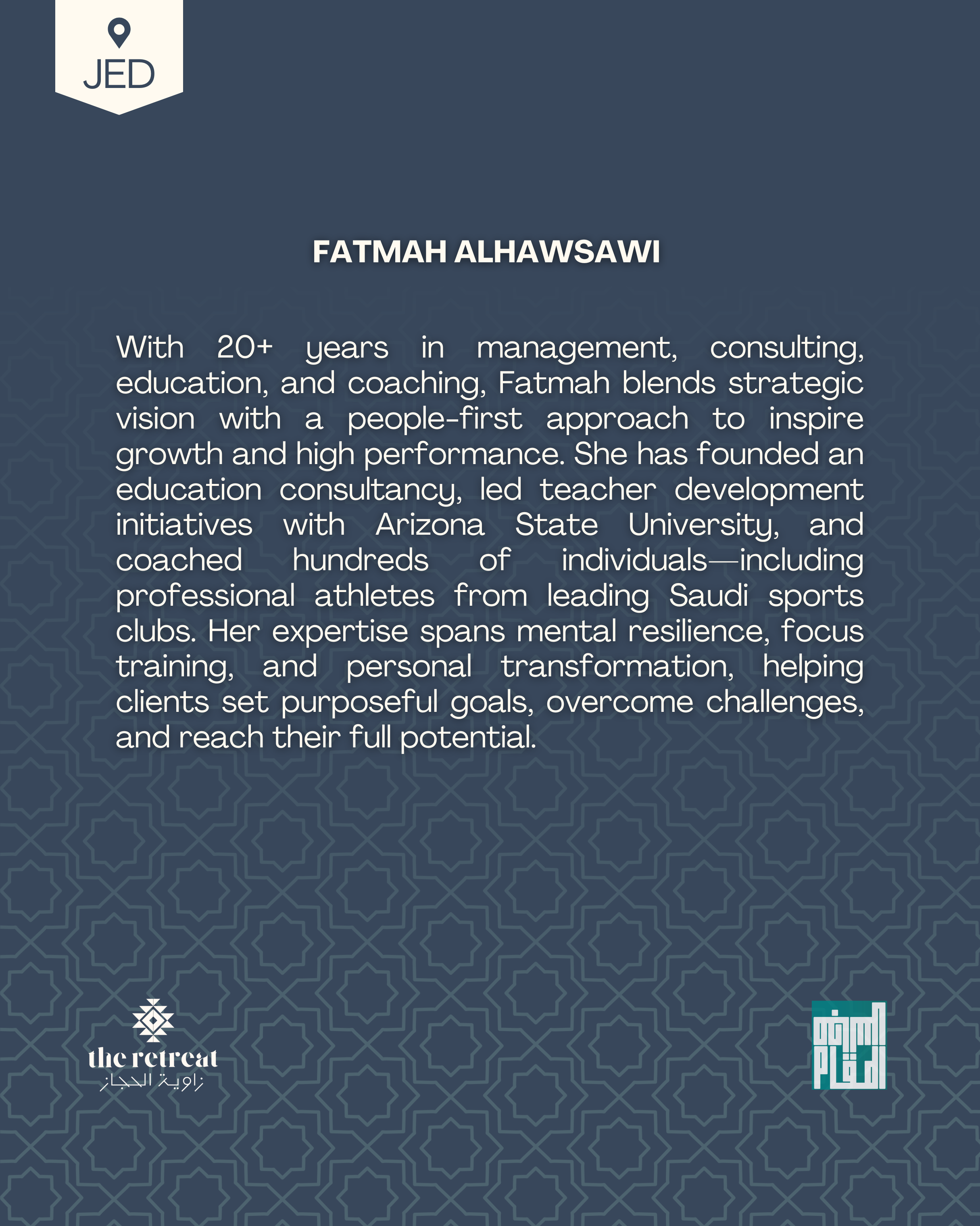 With 20+ years in management, consulting, education, and coaching, Fatmah blends strategic vision with a people-first approach to inspire growth and high performance. She has founded an education consultancy, led teacher development initiatives with Arizona State University, and coached hundreds of individuals—including professional athletes from leading Saudi sports clubs. Her expertise spans mental resilience, focus training, and personal transformation, helping clients set purposeful goals, overcome challenges, and reach their full potential.