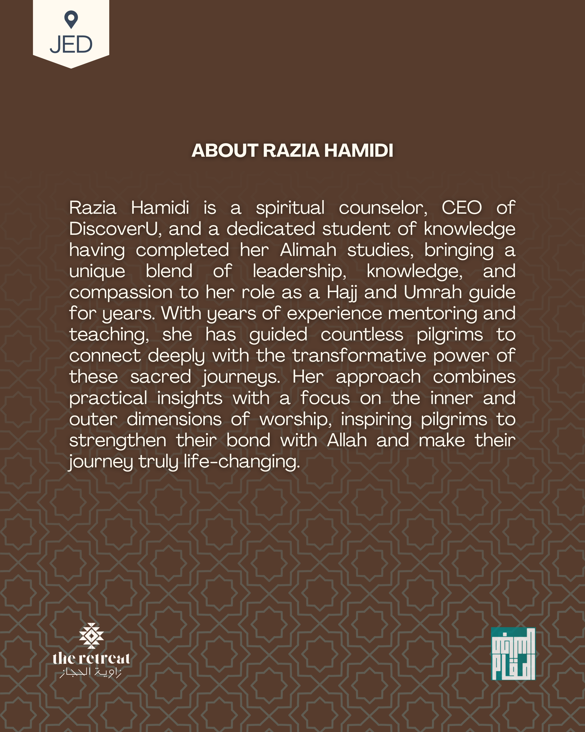 Razia Hamidi is a spiritual counselor, CEO of DiscoverU, and a dedicated student of knowledge having completed her Alimah studies, bringing a unique blend of leadership, knowledge, and compassion to her role as a Hajj and Umrah guide for years. With years of experience mentoring and teaching, she has guided countless pilgrims to connect deeply with the transformative power of these sacred journeys. Her approach combines practical insights with a focus on the inner and outer dimensions of worship, inspiring pilgrims to strengthen their bond with Allah and make their journey truly life-changing.